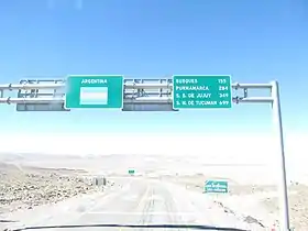 The Paso de Jama is a mountain pass through the Andes between Chile and Argentina, at an elevation of 4,200 m (13,800 ft) at the border.[2][3] It is the northernmost road border crossing between the two countries. The pass is reached via Chile Route 27 and via National Route 52 (Argentina). The Chile Route 27 reaches an altitude according to OpenStreetMap of 4,831 metres (15,850 ft) at 23°04′21″S 67°30′17″W [4] in a roaddistance of 57.6 kilometres (35.8 mi) west of the border, making it one of the highest highways in South America.