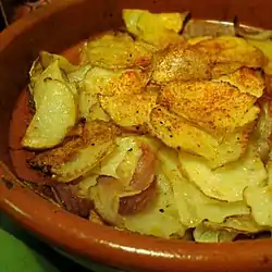 Patatas a lo pobre (lit. poor man's potatoes) is a simple potato dish from Andalusian cuisine. To make the dish thinly sliced potatoes are fried in olive oil to a very soft consistency (like confit potatoes) with onion. Then the oil is drained and garlic, parsley and vinegar are added to the hot frying pan to season the finished dish.[1][2] They can also be served with an egg (con huevo).[1] Some other ingredients like bell peppers, garlic and wine vinegar can be used.[3]
