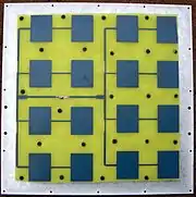 A patch antenna is a type of antenna with a low profile, which can be mounted on a surface. It consists of a planar rectangular, circular, triangular, or any geometrical sheet or "patch" of metal, mounted over a larger sheet of metal called a ground plane. They are the original type of microstrip antenna described by Howell in 1972;[1] the two metal sheets together form a resonant piece of microstrip transmission line with a length of approximately one-half wavelength of the radio waves. The radiation mechanism arises from fringing fields along the radiating edges.[2] The radiation at the edges causes the antenna to act slightly larger electrically than its physical dimensions, so in order for the antenna to be resonant, a length of microstrip transmission line slightly shorter than one-half the wavelength at the frequency is used. The patch antenna is mainly practical at microwave frequencies, at which wavelengths are short enough that the patches are conveniently small. It is widely used in portable wireless devices because of the ease of fabricating it on printed circuit boards. Multiple patch antennas on the same substrate (see image) called microstrip antennas, can be used to make high gain array antennas, and phased arrays in which the beam can be electronically steered.