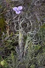 Patersonia spirafolia is a perennial herb which grows to 50 cm high in tussocks up to 40 cm wide. It has a woody rootstock. The leaves are linear (20 cm by 5 mm) and spirally twisted. The leaf margins are fringed with soft hairs pointing towards the centre of the leaf. The reddish-green scape is up to 25 cm long, 1-2 mm wide. The structure which envelops the flower cluster is brown. The flowers have three broad, mauve sepals and three very small, upright, blue-violet petals.[5]