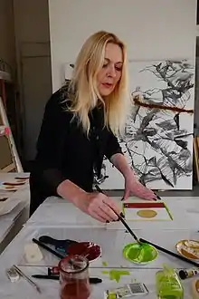 After literary studies, she worked in a number of professions before starting painting full-time in 1988. She is a figure of the new scene in Abstract Art and is known for the unique technique in painting as well as for her Artist's books. Her work has been exhibited at the Industry Museum (now renamed "Bois du Cazier") of Charleroi in Belgium;[2] the Nagoya Museum; the Toyama Museum; the Osaka Municipal Museum of Art[3] and the Aichi Prefectural Museum of Art in Japan; the Taipei Fine Arts Museum, Taiwan;[4][5] the Musée des Avelines, Saint Cloud, France; the Swedish American Museum in Chicago; the Museum of Modern Art, Maracaibo, Venezuela; the Sofia Imber Contemporary Art Museum, Caracas, Venezuela; the Metropolitan Museum of Art and Sejong Center in Seoul, Korea; the Collage Museum, Mexico;[6] the Musée Barrois in Bar-Le-Duc, France;[7] the Argonne Museum in Varennes, France; the O Art Museum, in Tokyo, Japan; the Art and Historical Museum of Montbeliard, France; the Leepa-Rattner Museum of Art, Tarpon Springs, Florida; the Austin Museum of Art, Austin, Texas.[8] Her work was exhibited at the FSU Museum of Fine Arts, Tallahassee, Florida in 2011 [9] and 2012.