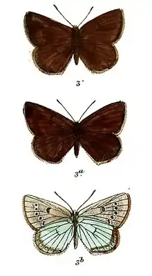 This form, collected by Capt. Walton, I.M.S., during the late Tibet Expedition, is very close to, even if it can be considered at all distinct from L. felicis, Oberthur, which was also abundant at Gyantze. I have been quite unable to identify and separate the female from the females of felicis. The chief points of difference in the male are "the dark leaden grey instead of greyish-brown colour above" and the obsolescence of the terminal markings.[1]