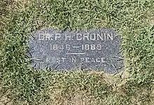 Dr. Patrick Henry Cronin's funeral was the most attended since Abraham Lincoln's body arrived in Chicago.[22] On Saturday, May 25, 1889, nearly 12,000 people visited Cavalry Armory on Michigan Avenue to see Cronin's coffin.[23] The body was too decomposed and damaged to permit an open casket. On Sunday morning, May 26, the funeral procession made its way through the streets of Chicago. Cronin's casket was placed in a hearse and joined a procession of 8,000 people.[23] The procession moved north on Michigan Avenue to Rush Street, to Chicago Avenue, to State Street, to Holy Name Cathedral for the funeral mass.[24] Thousands of people gathered in the streets during the mass, waiting for the ceremony to end. Cronin's casket travelled to the funeral by train to Calvary Cemetery. Five thousand people gathered at the cemetery for the entombment.[25] Cronin was celebrated as an Irish American hero and a martyr.[26]