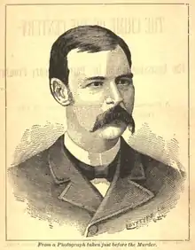 Cronin reportedly told friends that his life was in danger in the spring of 1889. Nonetheless, Cronin agreed to act as company physician of the employees of Patrick O'Sullivan. In return for a stipend, Cronin was hired to attend to any injured employee of O'Sullivan's ice business.[9] On March 20, 1889, Martin Burke, going by the name Frank Williams,[12] rented a cottage in suburban Lake View, now the Uptown neighborhood of Chicago, one block from the offices of O'Sullivan Ice Company. Burke told his landlord that his brother and invalid sister would be moving in with him and furniture, including a large trunk, was delivered to the cottage. On May 4, Chicago Police detective Daniel Coughlin came to a Chicago stable, and told the liveryman that later, a friend of his would need a horse and buggy. Coughlin instructed the liveryman to "say nothing to anyone about it." Later that day, Coughlin's friend came to fetch a two-seat buggy and a white horse.[13]