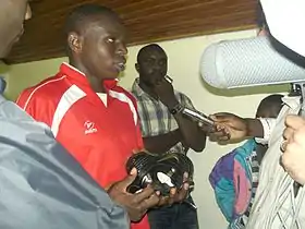 ![]() Oboya at a press conference in Nairobi | |||