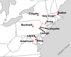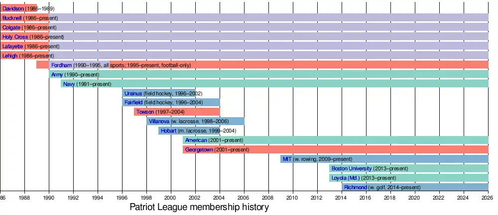 In 1995, Fordham resigned its full membership (leaving the league with seven full members) but continued as an associate member in football. In 1996, Fairfield and Ursinus joined as associate members in field hockey.[5] (Fairfield left after the 2003 fall season and is now an associate member of the America East Conference. Ursinus left after the 2001 fall season and is now a full member of the Centennial Conference.[7]) In 1997, Towson joined as an associate member in football. (Towson left after the 2003 fall season to join the Atlantic 10 Conference, whose football conference would be absorbed by the Colonial Athletic Association in 2007.) In 1999, Hobart joined as an associate member in men's lacrosse and Villanova joined as an associate member in women's lacrosse. (Hobart left after the 2004 spring season, to join the ECAC Lacrosse League, while Villanova left after the 2006 spring season.) In 2001, American University joined as the eighth full member and Georgetown University joined as an associate member in football.[5] Two schools announced in summer 2012 that they would join the league for the 2013–14 academic year, with Boston University making its announcement on June 15,[8] and Loyola University Maryland doing so on August 29.[9]