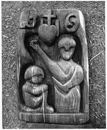 He found his calling as a carver of sacred objects in 1931. He repaired a figure of St Antonio and he later recounted that he knew that someone was going to make 20 dollars from his work and he was promised five. Although the five dollars never appeared, Barela realized that his work had value and he continued to make figures. He was taken on by the Works Progress Administration working with a horse and cart. His carvings were spotted and he was set to do those instead, eventually as part of the Public Works of Art Project. Because he was illiterate he was given a sheet filled with squares to which he would add a cross every day to record his work. This was in 1935 and eventually his work was exhibited at the Museum of Modern Art but he had no ambition to see the eight objects chosen as part of a Federal Arts Project exhibition there.[4] He was lauded by the museum as "the most dramatic discovery" and he was called "discovery of the year" by Time magazine.[5] Two other exhibitions of his work in 1939 further established Barela nationally, the San Francisco Golden Gate Exposition and the American Art Today show at the New York World's Fair.[6]