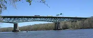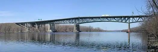 The Patroon Island Bridge is a multi-span deck truss bridge that spans the Hudson River in Albany, New York. A major crossing, it carries Interstate 90 in the east-west direction between Albany and Rensselaer Counties. It has been in service since 1968, with structural repairs made in 1992, and a comprehensive renovation/retrofit completed in 2016.