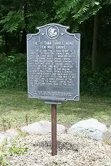 Ten Mile Grove is said to be the earliest settlement in Patton Township with about a dozen families residing there in 1853. It was located on the Danville-Ottawa road and named such because it was ten miles (16 km) from the nearest settlement.[5] The grove is partly contained in the Howard Thomas Memorial Nature Preserve. The preserve, containing many Bur oak, sustained damage in a 2004 wind storm which felled numerous trees. Thirty to fifty percent of trees were felled in some portions, especially the western part. Volunteers cleared trees from the trails, one of which had 17 trees blocking it.[6]