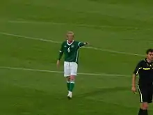 Despite being born in England, Green chose to represent the Republic of Ireland at international level. He qualified to play for Ireland through his grandfather on his mother's side, who is from Westport, County Mayo.[64][65] Green was called up to Giovanni Trapattoni's Irish training camp squad taking place in Malahide, Dublin, in May 2010.[66] He was called up to the full squad for friendlies against Paraguay and Algeria,[67] before playing the full 90 minutes of a Republic of Ireland XI vs Irish amateur match.[68] On 25 May 2010, Green won his first full cap in a 2–1 win against Paraguay at the RDS Arena, coming on in the second half.[69] Three days later he made his first international start, against Algeria, and scored his first international goal in the 32nd minute in a 3–0 win.[70] His first competitive start came in a 1–0 win over Armenia in September 2010. He was a late replacement for the injured Keith Fahey in the UEFA Euro 2012 squad.[71] On 14 June 2012, he appeared as a substitute in the 4–0 defeat by Spain at UEFA Euro 2012.[72]