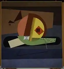 He left Germany for the United States in 1925, staying in New Jersey and New York City.[7] During this period, he integrated found objects into his paintings,[2] resulting in works containing two- and three-dimensional elements. Kelpe was the first artist to create such combine paintings in the United States.[7] His constructions "show a keen formal understanding and playful wit".[6] In the early 1930s he moved on from this assemblage technique; rather than incorporating physical objects into his works, he instead began painting mechanical parts such as wheels and gears into his abstractions.[2] A reviewer noted that Kelpe's "hard-edged geometric paintings ... celebrate the harmony of man and machine".[6]