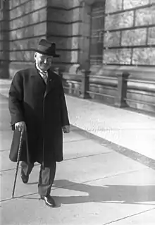 Between 1904 and 1919 Löbe was in the Breslau city council and from 1915 to 1920 a member of the provincial parliament (Landtag) of Silesia. During the German Revolution of 1918–1919 Löbe declined to join the Council of the People's Deputies, the interim body under Friedrich Ebert (SPD) that led the country during the turbulent post-war months, because he felt himself "not yet sufficiently prepared for such a task".[5] In the election of January 1919, the first in Germany with full suffrage for both women and men, Löbe was elected to the Weimar National Assembly, the parliamentary group that wrote the constitution of the Weimar Republic and served as Germany's interim Reichstag. In June 1919 he became one of the assembly's vice presidents. He was a member of the Reichstag from its first Weimar Republic sitting in 1920 until 1933. In 1921 he also became a member of the Prussian Council of State (Staatsrat). From 1920 to 1924 (1st electoral period) and from 1925 to 1932 (3rd-5th electoral periods) he was President of the Reichstag, a position that was responsible for maintaining and organizing the Reichstag's self-government. In 1919 and 1920, he made efforts to reach an understanding with the moderate wing of the Independent Social Democratic Party (USPD), the antiwar and more left-leaning wing of the SPD that had broken away in 1917; it rejoined the SPD in 1922. After Ebert died in 1925, Löbe declined his party's offer to run as the SPD candidate in the presidential election against the conservative Paul von Hindenburg who won in the second round. Löbe saw his place to be in the parliament. From 1932 to 1933 (7th electoral period) he was Reichstag vice-president.