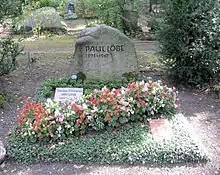 In 1945 he became editor of the daily newspaper Das Volk, and later a co-publisher of the Telegraf, a daily newspaper close to the SPD in the British sector of Berlin. In 1949 Löbe became the founding president of the European Movement Germany.[14] From 1954 until his death he was chairman of the Advisory Board of Indivisible Germany, an organization whose aim was the peaceful reunification of Germany. He died in West Germany's capital, Bonn on 3 August 1967 and was given an honorary grave by the city of Berlin.