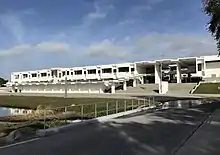 Another school building design in Sarasota was Rudolph's 1960 addition to Sarasota High School, a concrete structure that utilized large overhanging sunshades and "internal" yet outside corridors with natural ventilation. This building, along with a gymnasium structure built at the same time, has recently undergone a renovation by the Sarasota County School Board that reinstated the building's original exterior appearance, but contains a completely new interior layout.[8]