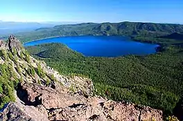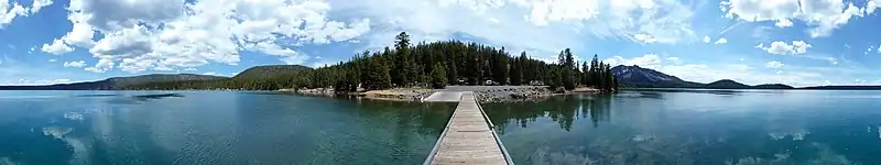 Paulina Lake is one of the twin crater lakes in Newberry Crater, central Oregon, United States (the other being East Lake). It is located 6,331 feet (1,930 m) above sea level in the Newberry National Volcanic Monument near La Pine. The lake's primary inflow is seepage from East Lake, snow melt, and hot springs, and its outflow is Paulina Creek, a tributary of the Little Deschutes River. It has an area of 1,531 acres (619.6 ha), a volume of 249,850 acre-feet (308,185 dam3), a maximum depth of 250 feet (76.2 m), a shore length of about 6.7 miles (11 km), and a residence time of about 46 years.[2] The lake is classified as mesotrophic, with a transparency of approximately 13.1 feet (3.99 m).[2] It is about 40 feet (12 m) lower and one mile west of its twin, East Lake.
