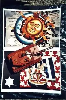 In 2006, she distributed Tombs of the Last (Species) to all members of Parliament followed by SPECIES TOMBS circulated to all MPs in 2008.[2] In 2013 she produced Sun and Moon as a commentary on military action in the Middle East which featured a Sun and Moon, a carousel horse, and a tank against a split background with an Arabic language newspaper in the top half and a deconstructed American flag below.[1]