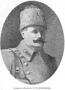 Pavel Illyich Bulgakov (3 August 1856 – 1940) was an Imperial Russian division and corps commander. He fought in the war against the Ottoman Empire. He took part in the Russian invasion of East Prussia, a part of the German Empire. On 18 February 1915, his forces were surrounded the German Tenth Army in the Augustow Forest. On 21 February 1915 he and surviving men surrendered. This provided time for the rest of the Russian Tenth Army to form a new defensive position. Bulgakov was taken prisoner by the Germans and remained in captivity until after the Treaty of Brest-Litovsk. On 3 August 1918 he was released. He traveled by train to Mtsensk in Oryol Oblast, where he was hospitalized after arriving on 8 August 1918. On 6 September 1918 he went to Bălți, Bessarabia (now in Moldova, then controlled by Romania). He remained there for the duration of the Russian Civil War and after the Bolshevik victory. He died shortly after Bessarabia was annexed by the Soviet Union.