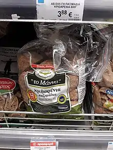 Paximathia (Greek: παξιμάδια), also spelt paximadia (plural), or paximadi/paximathi (singular), is a hard bread of Greek origin, similar to rusk, that is prepared with whole wheat, chick pea or barley flour.[1][2][3] It has been referred to as being similar to biscotti or as a type of biscotti.[4] Paximathia is a common food in Greece and many Greek bakeries sell the bread, which is often served as a breakfast food with marmalade or cheese.[1][5] Paximathia is purveyed also in Greek specialty stores in many areas of the United States.[5]