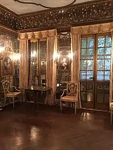 The Venetian Room, measuring 14 feet 10 inches (4.52 m) square,[33] is just east of the rotunda, on the south wall of the house.[27] It is accessed by wrought-iron doors from the rotunda.[34] Serving as a reception room for the Whitney family, the Venetian Room was used to receive guests before they proceeded upstairs. The room also has a variety of furnishings, including painted furniture and a French-style clock.[33][34] The Venetian Room is designed with mirrors on the walls, framed by gold leaf.[33] The ceiling was originally decorated with latticework containing plants and flowers.[28] When the Venetian Room was restored in 1998, John Russell wrote for The New York Times that, while he considered the design "imperfect", "White's appetite for life is everywhere present, as is his sense of affectionate companionship".[33] As of 2021, the public has limited access to the room.[35] North of the Venetian Room is a corridor leading from the rotunda to restrooms and private offices.[27]