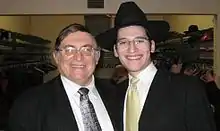 ![]() Rabbi Paysach Krohn (left), posing with a fan , after speaking in Passaic, New Jersey in December 2007. | |