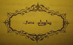A Pazend title (for a published Avesta) that reads pargart auual (as transliterated in the Hoffmann system) and demonstrates the use of the el grapheme (leftmost symbol here, resembling a Latin 'p'). This letter was added to the alphabet specifically for use in Pazend script; it is not needed for writing the Avestan language.
