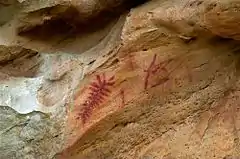 The rock and cave art is found in shelters made of sandstone. The paintings, of symbolic character, appear in twenty-five of these shelters and date from the post paleolithic era. Within their complex designs, one finds isolated patterns grouped together. The designs were produced with different shades of red mainly using the fingers. Anthropomorphic shapes predominate and were represented in a variety of ways, some with added elements showing headdresses, costumes, weapons, etc. The painted objects themselves are also varied and remain characteristic of these displays; they comprise arrangements which are circular, branched, bi-triangular, quadrangular, braided, comb-like and ocular.