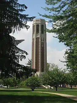 Peabody Memorial Tower, also known as the Singing Tower, is a historic structure located at North Manchester, Wabash County, Indiana. It was designed by architect Charles R. Weatherhogg and built in 1937. The structure consists of a cube shaped limestone mausoleum at the base topped by a brick and limestone carillon that reaches 110 feet tall. It has streamlined Art Deco character with Tudor Revival features.[2]