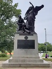 The monument features the "angel of peace" (modeled by Audrey Munson), holding an olive branch, standing over a Confederate soldier who has a gun in his hands, telling the soldier that peace has been proclaimed.[11]