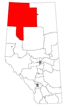 | Northwest Territories boundary | Fort McMurray-Wood Buffalo and Lesser Slave Lake | British Columbia boundary | Dunvegan-Central Peace-Notley |