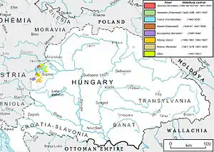 Immediately after the recovery of Sopron, Frederick III allowed Czech captain Hinko Tannfeld of Waltersdorf to sack the town on 7 September 1465. The attacking troops departed from the Austrian town of Waltersdorf, which was a direct insult to Matthias, who immediately protested. The Emperor expressed his regret but did not return the plunder. In retaliation, the garrison of Sopron withheld and foreclosed a wine shipment to Wiener Neustadt in 1466 and demanded the compensation again, which still remained undone.[5] The treaty opened the gates for Matthias to crown himself King of Hungary. His rule led to a series of wars, and their advantageous outcome resulted in Matthias being crowned King of Bohemia (1469–1490) and Duke of Austria (1486–1490).[7] The crusade never came into being, as the campaign funds promised by Venice were never provided. The effort eventually ended in the Bohemian Wars (1468–78) where Matthias incorporated Bohemia into Hungary.[8] The military feud between the Holy Roman Empire and Hungary continued after the succession of the concerned Kings. The field of conflict also affected the mortgaged towns. No armed support was given to Frederick or Maximilian, as was laid in the terms. Towards the end of his reign, Matthias turned away from the papacy, by protecting the Kingdom of Naples against the Papal army in 1488, siding with the rebellious Papal citizens of Ancona in 1488 by making them a Hungarian Protectorate, and even signing a status quo peace treaty with the Ottoman Empire.[9] Following his death, the Habsburgs strengthened the terms in the Second Treaty of Pressburg and secured in the First Congress of Vienna. They claimed the throne several times until Ferdinand I, Holy Roman Emperor co-reigned there, and Maximilian II, Holy Roman Emperor single-handedly ruled Hungary, which established a Habsburg line of succession that lasted to World War I.[10]