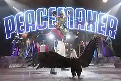 Several recurring guests were also cast in December: Lochlyn Munro as Larry Fitzgibbon, Annie Chang as Detective Sophie Song, and Christopher Heyerdahl as Captain Locke.[12] Munro was cast after Gunn saw his audition and remembered that Munro had been one of his choices for the role of Shaggy Rogers in Scooby-Doo (2002) prior to Matthew Lillard's casting for that film.[44] In February 2021, several more recurring roles were cast: Elizabeth Ludlow as Keeya, Rizwan Manji as Jamil, Nhut Le as Judomaster, and Alison Araya and Lenny Jacobson as the couple Amber and Evan.[23][24][25] In late May, Freddie Stroma was cast to replace Conrad as Adrian Chase / Vigilante, after Conrad left the series due to creative differences.[10] The series' premiere revealed that Viola Davis reprises her DCEU role as Amanda Waller,[27] while Dee Bradley Baker voices Peacemaker's pet bald eagle, Eagly, after also voicing Ratcatcher 2's pet rat Sebastian in The Suicide Squad.[29] Stephen Blackehart, who made cameo appearances in many of Gunn's previous films including The Suicide Squad, voices the possessed gorilla Charlie.[30]