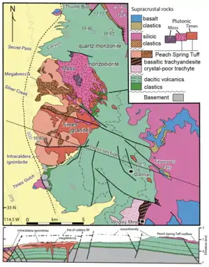 The Peach Spring Tuff is a pyroclastic flow sheet deposit spanning 32,000 km2 in California, Arizona, and Nevada. The source of the Peach Spring Tuff is the Silver Creek Caldera located outside of Oatman, AZ. The Silver Creek Caldera was found to be a match to the Peach Spring Tuff after an ignimbrite sample from within the caldera matched the phenocryst makeup and age of the Peach Spring Tuff. The caldera eruption is dated to the early Miocene, radiometrically dated to 18.78 +/- 0.02 Ma using argon-argon dating methods on sanidine crystals. The Peach Spring Tuff has a rhyolitic composition with thickness ranging from 10-140 m depending on location.[1] The Peach Spring Tuff is the only geologic evidence of a super-eruption in this region.[2]