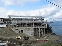 During the winter, the remaining two gondola towers and each terminal’s machinery were built at the Garaventa factory in Goldau, Switzerland and the Doppelmayr factories in Wolfurt, Austria and Saint-Jérôme, Quebec. Fatzer AG manufactured the four track cables and haul rope that would suspend the gondola cabins.[8] The five spools of cable left Europe by ship on April 10, 2008. By the time construction started again in the spring of 2008, ten feet of snow still covered the mountains and concrete had to be transported up the mountain by helicopter.[10] Towers 4 and 1 were completed in early spring using mobile cranes.