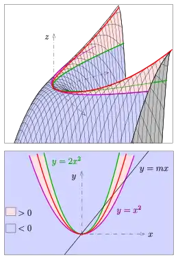 Although the surface does not have a local maximum at the origin, its intersection with any vertical plane through the origin (a plane with equation or ) is a curve that has a local maximum at the origin,[1] a property described by Earle Raymond Hedrick as "paradoxical".[7] In other words, if a point starts at the origin of the plane, and moves away from the origin along any straight line, the value of will decrease at the start of the motion. Nevertheless, is not a local maximum of the function, because moving along a parabola such as (in diagram: red) will cause the function value to increase.