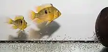 The sex of the fish is often unclear until it reaches adult size, at which point the size difference between the genders becomes pronounced. Breeders often attempt to pair the fish without sexing them; two females may pair up in which case the fish lay eggs that never hatch. Once a male-female pair is found, they tend to yield 150–200 offspring after successfully mating. Unlike certain other species, they do not have to be separated from their young.