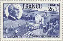 After many revisions and some objections from the Germans the Peasant Charter was promulgated on 2 December 1940.[4] Pierre Caziot was Minister of Agriculture and Supplies from 12 July 1940 to 6 September 1940, then Secretary of State for Agriculture and Supplies from 6 September 1940 to 13 December 1940 in the government of Marshal Philippe Pétain.[6] He was Minister and Secretary of State for Agriculture from 13 December 1940 to 18 April 1942 in the governments of Pétain and François Darlan.[6] Caziot promulgated the law of 2 December 1940 that organized the Peasant Corporation.[7] Although he was in favor of a national peasant organization, Caziot accepted the word "corporation" only at Pétain's insistence.[8]