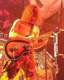 In some sense, the Peavey EVH Wolfgang guitar picked up where the Ernie Ball Music Man EVH model left off, with the prototype design being made by Peavey Design Engineer/Luthier Jim DeCola (an amber quilted top model which still didn't have the Wolfgang headstock shape, but rather a Peavey classic one). On the second prototype, DeCola then developed the final body and headstock designs. Another innovative feature DeCola designed was the recessed truss rod adjustment wheel. Recessing the adjustment wheel into the neck provided a stronger neck joint as well as ease of adjustment like his previous model. This design has since been adopted by Fender, Jackson, Charvel, ESP, Schecter, and many other brands. The body was made of basswood and often had (like its predecessor) a maple cap. This combination is considered by some, such as renowned luthier John Suhr, "the Holy Grail of tone."[3] The Ernie Ball model, however, used a 1/8" figured maple cap, which is itself less likely to change the overall effect of the tonewood. Peavey Wolfgangs had maple caps ranging from 1/4" to 5/8". The guitar had a Floyd Rose vibrato system, built by Ping, which lowers pitch only (like the Ernie Ball Music Man EVH model) but added a d-Tuna on the low E-string, a device that allowed that string to be instantly tuned to and from D (a former design of this device, named "The Willie",[4] was filed for patent by Eddie in 1997, but later abandoned in 1998).