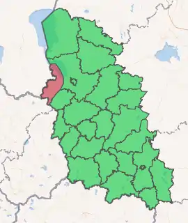 Pechorsky District (Russian: Печо́рский райо́н) is an administrative[1] and municipal[3] district (raion), one of the twenty-four in Pskov Oblast, Russia. It is located in the northwest of the oblast and borders with Pskovsky District in the northwest, Palkinsky District in the southeast, Alūksne municipality of Latvia in the southwest, and with Võru and Põlva Counties of Estonia in the northwest. Lake Peipus limits the district from the north. The area of the district is 1,251 square kilometers (483 sq mi).[4] Its administrative center is the town of Pechory.[3] Population: 22,123 (2010 Census);[5] 25,300 (2002 Census);[8] 27,199 (1989 Census).[9] The population of Pechory accounts for 50.6% of the district's total population.[5]