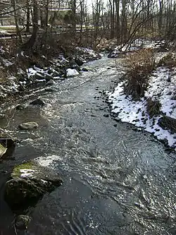 The Peckman River passes through a number of suburban areas en route from its narrow and shallow start at Eagle Rock Reservation in West Orange. Few features define the waterway save for a short waterfall and pool, known as Devil's Hole, located in Cedar Grove and which is used locally as a swimming hole. The falls were created by the addition of Van Orden's Dam during the Dutch settlement of the region.[1] Historians state that the water from Devil's Hole previously powered a steam boiler at the Van Orden Corset Company factory south of the site.[2][3] On June 18, 2014, a teenager from Newark, NJ drowned while swimming in the hole.[4] Swimming in Devil's Hole was banned by a local ordinance in 2018.[5]
