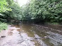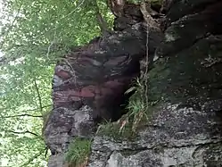 Peden's Cave is at least partly artificial[1] and is set into a craggy outcrop of red sandstone rocks overlooking the River Lugar just below the farm of Auchinbay in East Ayrshire, Scotland, close to the town of Ochiltree. Traditionally it is said that this cave was used as a hiding place for Covenanters, including the famous Covenanter minister Alexander Peden in the 17th century, mainly during the so-called 'Killing Times' of the 1680s.[2][3]