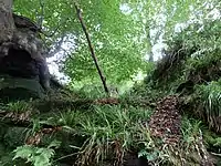 The opening is obvious from the opposite side of the Lugar Water however this is difficult to access and it is likely that, as at Dunton Cove, a bush such as gorse or willow would be cut and then pulled up and tied with ropes over the entrance as camouflage.[9] Next to the cave is a sizeable rectangular area which it has been noted has features indicating that it may have been artificially shaped or quarried and even roofed over for use in stabling of horses, storage of food, etc.[10]
