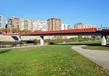 Pedestrian Bridge over the Segre River is a bridge in Lleida, Catalonia, Spain. In 2000, Lleida City Council organized an open competition for a new pedestrian bridge. The pedestrian bridge outstands with sober lines, landscape architectural features, and delicate details. It is meant to mark the doorway into The Campus and achieve a double function: communication and public space.