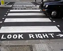 Road markings with the text "Look right" and "Look left" are sometimes used at pedestrian crossings to indicate to pedestrians the direction from which traffic will approach. Common uses may be a pedestrian island on a one way street or where a contraflow bus lane is in use.[6] At times these markings have been painted incorrectly, which can create confusing situations for pedestrians. For example, on a street in Islington, the words "look right" were painted, although the accompanying arrow pointed left and traffic approached from the left.[7]