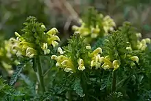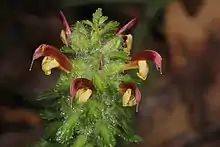 Pedicularis canadensis is a perennial, clonal, herbaceous plant, growing to 30 cm (12 in) tall.[7] It has long, soft, hairy leaves (many are basal, growing tufted from roots), some 12 to 36 cm (4.7 to 14.2 in) long, deeply incised and toothed, often reddish-purple under sunlight. It blooms in the spring to summer, between April and June.[8][9] It produces a broad whorl of tubular, hooded flowers on top of a segmented stalk. The flowers range in color from a greenish-yellow to purplish-red, clustered on short, dense spikes. They are pollinated by bumblebees. The fruit is a long brown seed capsule, which disperses through explosive dehiscence.[2]