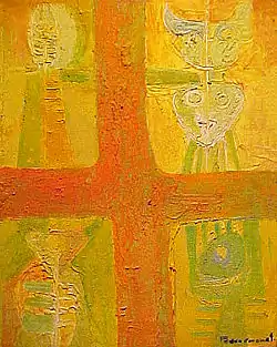 Although his aim in his work was spontaneity and freedom of expression, in reality it follows a trajectory leaning towards abstraction.[2] His work has been divided into stages such as naturalist, structuralist, lyrical, chromatic, and the revival of native indigenous themes.[1][3] His early work is mostly figurative. This work creates juxtapositions fields, idealistic images and a convergence of reality and fantasy. His later work is when his style is more personal and set, figures giving way to forms and color.[3] From 1953 to 1957 his work is influenced by Expressionism with some influence from Picasso with topics from everyday life such as bottles, glasses or lamps. Notable works from this period include Retrato de Mujer in 1953 and Naturaleza Muerta in 1956.[2] A later stage shows interest in allegories with mythical personages. These paintings include El Advenimiento de Ella and La Lucha both from 1958 and Mujeres Habitadas from 1960. After this, his paintings became more colorful with lines simplifying such as in Los Fantoches Luminarios in 1962 and Rincón de Sueño from 1961. From 1962 to 1963 influence from Rufino Tamayo can be seen in paintings such as Interno Mágico from 1963. From 1966 to 1975 he worked became more abstract. These years also encompass the majority of his production. This later work is characterized by taking the use of color to its limits but not overdoing it.[2] This use of color follows that of his predecessor, Rufino Tamayo, but Coronel’s innovation is the use of intense, more pure colors, and the harmonization of background with form, unlike other painters, including his brother Rafael, where the background is subservient to the main topic.[2] Two colors which dominate many of his works are red and yellow, which tend to reflect melancholy, passion and loneliness.[3]