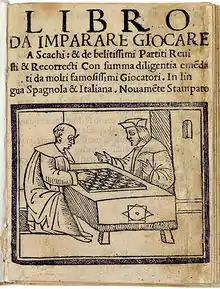 Pedro Damiano (Portuguese: Pedro Damião; Damiano is the Italian form, much like the Latin Damianus; 1480–1544) was a Portuguese chess player. A native of Odemira, he was a pharmacist by profession. He wrote Questo libro e da imparare giocare a scachi et de li partiti, published in Rome, Italy, in 1512; it went through eight editions in the sixteenth century. Damiano describes the rules of the game, offers advice on strategy, presents a selection of chess problems (see diagrams), and analyses a few openings. It is the oldest book that definitely states that the square on the right of the row closest to each player must be white. He also offers advice regarding blindfold chess, principally focused on the need to master notation based on numbering the squares 1–64 (Murray 1913, 788–89).