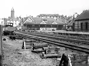 Most trains from Douglas to Peel were combined with trains to Ramsey. The two sections split at St John's. The IoMR timetable for July 1922 shows twelve trains arriving at Peel from Douglas on weekdays. Nine were 'split trains', whilst three were complete trains from Douglas. The first arrival was at 8:58 am and the last was at 11:40 pm. The average time taken for the 12 miles from Douglas was 40 minutes.[2] Regular trains ran to and from Douglas until the line was closed on 13 November 1965. Services resumed on 3 June 1967, but ceased permanently on 7 September 1968.[1] The reopening day of the line in 1967 saw the celebrations centred on this station and nearly all the railway's serviceable rolling stock was on site together with five steam locomotives on the day, and a fair held on the station forecourt to mark the event. The last time a locomotive was on the site was in 1998 as part of the Steam 125 celebrations marking the anniversary of the line's opening when locomotive No. 1 Sutherland was operated on a short section of temporary track in the car park which was once the island platform. At various times there have been plans to create short sections of track from the station but none of these have ever come to fruition, though the Manx Transport Museum Group have their headquarters in the nearby former brickworks office, holding a number of railway-related items.