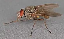 Pegomya winthemi is a species of fly in the family Anthomyiidae. Found in North America, it was first described as Anthomyia winthemi in 1829 by Johann Wilhelm Meigen. The insect measures 4.25–5 mm long.[1] Its pedipalps are infuscated (darkened with a brownish tinge) apically; the anterior lateral angles of the thorax and scutellum are yellowish red. The longest hairs of the arista are a little longer than its basal diameter, while the lower calyptra (small membranes above the halteres) are distinctly protruded. The scutellum is almost bare on the disc. The posthumeral bristle is not duplicated, and the area between the posthumeral and the margin of thorax is almost bare.[2]