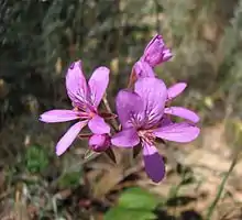 Pelargonium rodneyanum, commonly known as magenta storksbill, is a perennial herb species that is endemic to Australia. It grows to 40 cm high and has leaves with 5 to 7 shallow lobes.[2] Dark pink flowers appear between October and February in the species native range.[3]