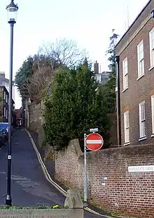 View up Watergate Lane with a dormer window forming part of the rear elevation of Pelham House just visible on the right of the trees